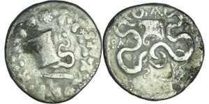 A/ Anépigraphe. Ciste mystique de laquelle s'échappe un serpent. Le tout dans une couronne dionysiaque.