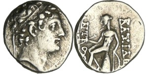 R/ ΒΑΣΙΛΕΩΕ / ΑΝΤΙΟXΟΥ. Apollon assis à gauche sur l'omphalos. Dans le champ à gauche, une cou ...