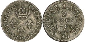 Lot 38/1134 FRENCH COLONIES :: Cayenne (Guyane) - Louis XVI (1774-1793) - 2 sous 1789 A (Paris)
