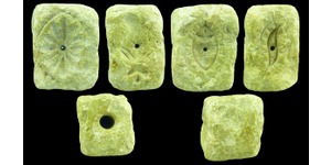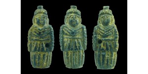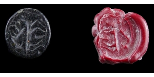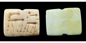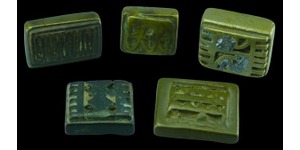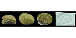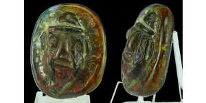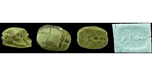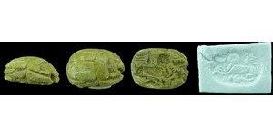 scarabée en pierre dont l'empreinte représente un cobra, une clé de vie et un personnage debout. Dimensions : 17*12 mm
