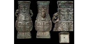 Vase Hu en bronze à patine verte, à décors de masque Taotie, prises anthropomorphes en forme de chauve-souris. Persage s ...