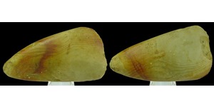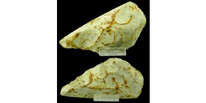 Hâche polie en pierre de couleur beige vénée de marron, Eclat sur le tranchant. Dimensions : 90*48 mm