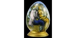 Oeuf en faïence représentant un couple en tenue du 19ème siècle dans des positions érotiques. Dimensions : 67*49 mm