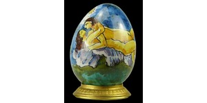 Oeuf en faïence représentant une scène érotique. Dimensions : 67*49 mm