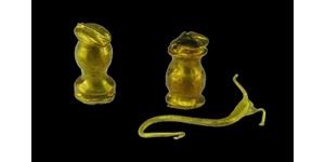 Petit alabastron en filet en pâte de verre polychrome marron, blanc et jaune. Dimension : 60 mm