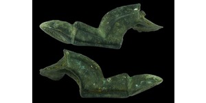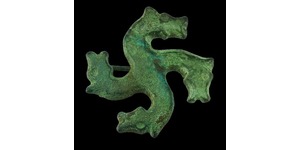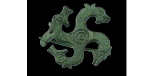Fibule en bronze en forme de svastika aux extrémités en forme de têtes de chevaux, avec son ardillon. Provenance Moselle ...