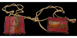 Sac à offrandes ou pochette à coca en tissu à prédominance rouge, avec une longue lanière tissée. Le sac est orné d'un c ...