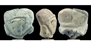 Ensemble de 2 têtes en terre cuite comportant de nombreux manques et des traces de recollage. Dimensions : 55*55 mm et 5 ...