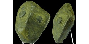 Importante tête d'idole schématique en pierre basaltique à engobe brune. Dimensions : 103*84*43 mm