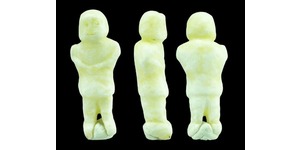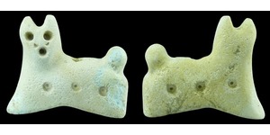 Idole zoomorphe en stéatite à engobe blanche siliceuse, représentant un chien recourbé, le corps orné d'osselles. Dimens ...