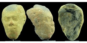 Tête en terre cuite à engobe brune et orangé. Quelques manques sur l'ensemble. Dimensions : 50*50 mm