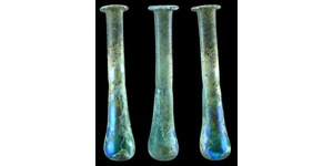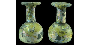 Petite fiole funéraire à large rebord et patine crouteuse. Une belle irisation polychrome variable sur la panse ( mauve, ...