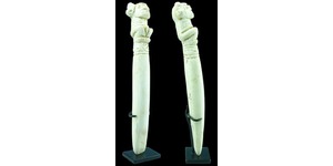 Tête de statuette Valdivia représentant un personnage féminin portant une grande coiffe rectangulaire. Dimensions : 47*4 ...